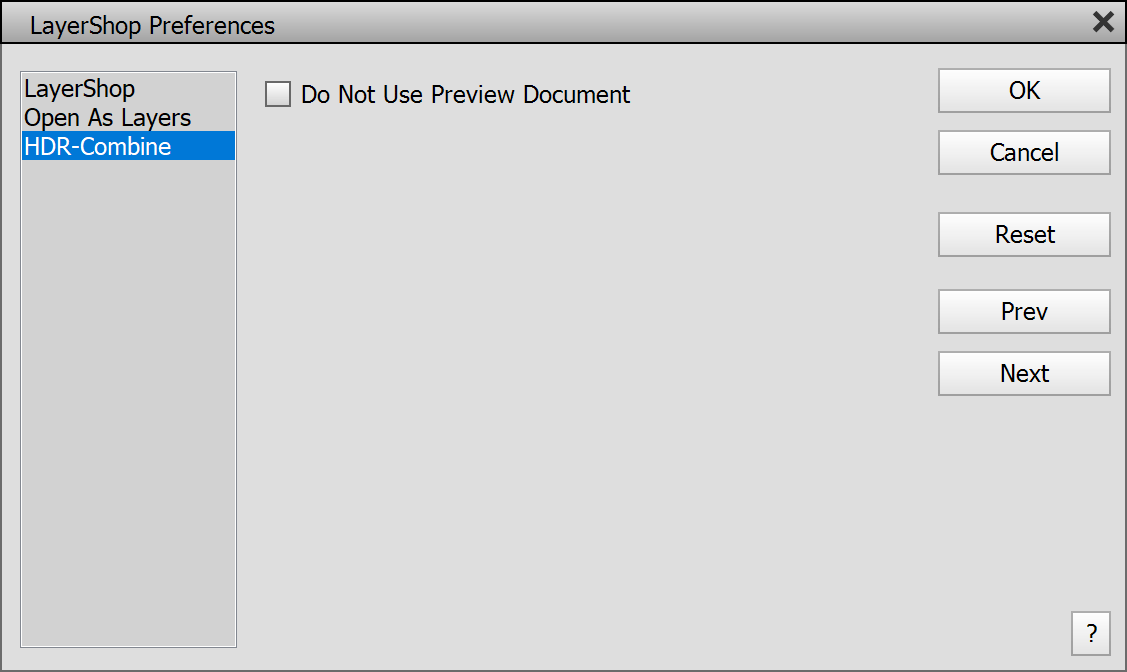 This HDR-Combine page contains an option for the HDR-Combine Layers command. By default, a new document for previewing the HDR effect is opened. As the preview image is downscaled, the effect is rendered and displayed faster when adjusting some sliders. As a downside it increases the render time before and after displaying the HDR-Combine dialog slightly. The Do Not Use Preview Document check box makes sure that no preview document is used. This means that the HDR-Combine will show up and vanish faster, but adjusting some of the slider will be slower. If you play a lot with the HDR settings, better keep this check box deactivated. If you often apply the same HDR settings, better activate it.