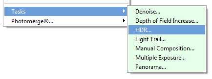The Tasks sub menu offers seven items for almost automatically performing certain tasks, which start with opening one or more images and end with the final image result.