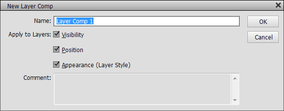 On the appearing dialog you can enter a name for the layer comp and decide which layer properties should be applied. If you are unsure, keep all three check boxes activated. If you like, you can also add a comment for explaining the meaning of this layer comp. After clicking OK, you will see the new layer comp in the list of the Layer Comps panel.