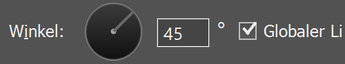 Mit dem Kästchen "Globaler Lichteinfall" teilen sich drei Effekte den selben Lichtwinkel (Abgeflachte Kanten, Schatten nach innen, Schlagschatten). Wenn also das Kästchen "Globaler Lichteinfall" aktiviert ist und Sie den Winkel ändern, verwenden die anderen Effekte, bei denen "Globaler Lichteinfall aktiviert ist, automatisch den gleichen Winkelwert. Wenn Sie das Kästchen "Globaler Lichteinfall" für einen Effekt deaktivieren, kann dieser Effekt wieder einen individuellen Winkelwert verwenden.