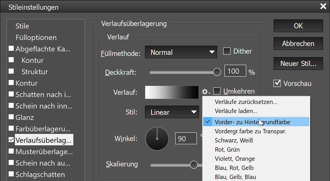 Wenn Sie auf das Verlaufs-Steuerelement klicken, erscheint das Fenster Verläufe bearbeiten. Hier können Sie andere Verläufe wählen, sie editieren und sogar komplett neue, eigene Verläufe erstellen.