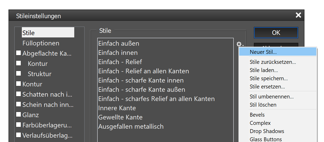 Letztendlich können Sie mit dem Menüpunkt Neuer Stil einen neuen Stil aus den aktuell aktiven Ebeneneffekten erstellen. Die Schaltfläche Neuer Stil hat die selbe Funktion. Im Dialog "Neuer Stil" können Sie entscheiden, ob Sie nur die Einstellungen der Ebeneneffekte speichern möchten oder auch die Einstellungen der Fülloptionen in der Vorgabe enthalten sein soll.