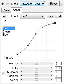 The Intensity slider increases or decreases the amplitude of the curves and the intensity of the controls on the RGB sub tab. It influences both the black curve as well as the other sliders below the curve. Slider values below zero make the red output curve move towards the base line thus decreasing the color effect. Values above zero make the red curve move further away from the base line thus increasing the color effect. At a value of zero the Intensity slider does not influence the curve and the sliders.