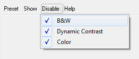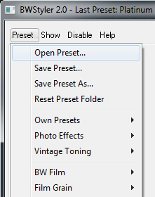 The Disable menu displays the names of the currently active BWStyler effects. Clicking a menu item disables the selected effect. This can be useful for removing individual effects of a preset that you do not want to use, e.g. the grain or brightness adjustments.