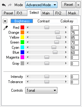 When you select "Tonal" in the Controls combo box at the bottom of the tab sheet you will see three sub tabs at the top in Advanced Mode. Each sub tab contains seven or eight color sliders for adjusting the brightness, contrast and color recovery of image areas with a certain color. In Advanced+ Mode there are no sub tabs, but you can choose the same three items from the Effect combo box. Move the sliders to the left to decrease the brightness, contrast and color key effect and move them to the right to increase them. Double click the slider label to reset a slider to zero.