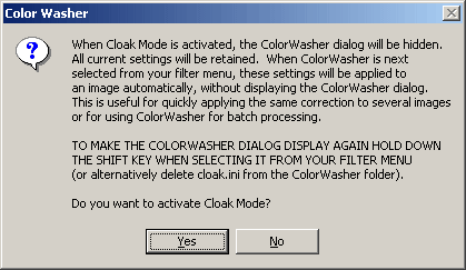 If you decided to use Cloak Mode, you can activate it by holding down the CTRL key and clicking on the Cancel button. The message box displayed below will appear. After pressing YES, the current settings will be saved and ColorWasher will be exited without rendering the effect to the image.