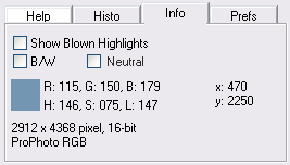 The two lines at the bottom of the Info tab sheet show the image size in pixel and the channel bit depth. The second line only appears in the Standalone/Lightroom version and names the color space of the image or shows "No Profile" if no profile was embedded in the image file.