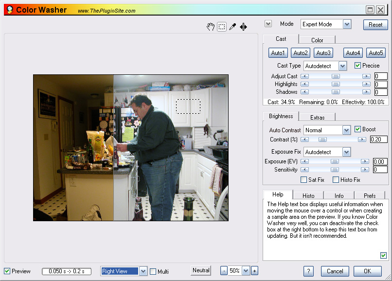 ColorWasher 2 offers a greatly improved color and exposure correction and a vast amount of other new features and improvements. Color casts are better removed from the shadows, red and orange casts are treated more effectively and the automatic exposure fixing works much more reliable and effective. Better results on more difficult photos can be achieved with a second sample area and the new sliders for adjusting the color correction in the highlight and shadow areas. ColorWasher now supports 16bit images, processes huge images with little RAM and renders faster. Its dialog is resizable and tab sheets with many new features were added. The new saturation feature lets you adjust the image with the help of 10 different saturation methods and the new Histo tab displays 10 histogram types in four different styles. The new Log Settings feature uses the image name to automatically save preset files that can later be automatically applied when processing the same image again. Other improvements include Contrast Boost option, highlight and shadow contrast sliders, exposure correction in EV units, a Multiple option for mirroring the split views, color cast statistics, identification of blown highlights, selections display in the preview and preference settings among many others. You can also switch between 7 languages on the Prefs tab sheet.