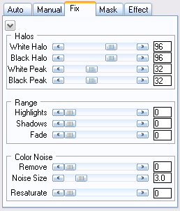 The Fix tab sheet contains controls for suppressing halos, weakening the effect and for removing color noise.