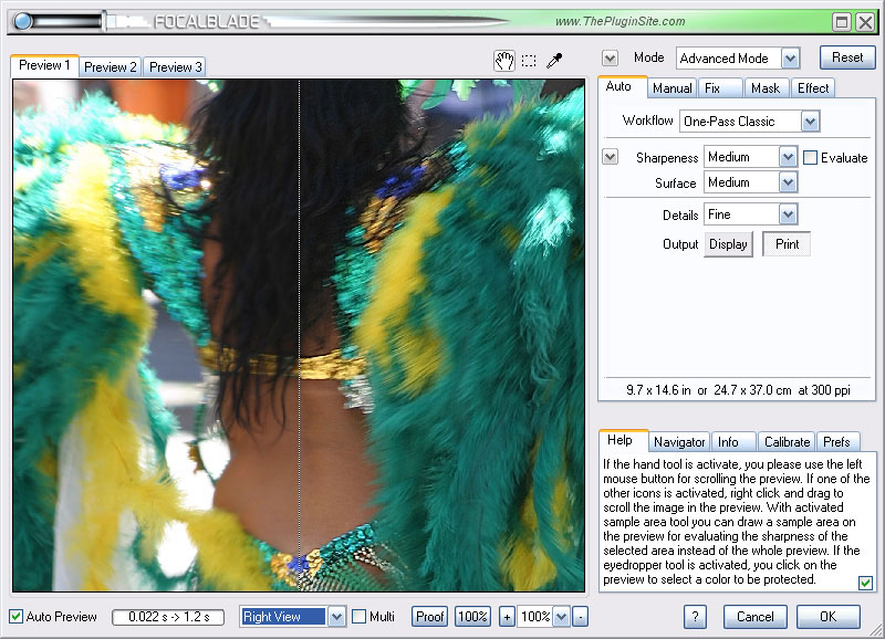 The Help tab sheet displays useful information about a control if you move the cursor over it. The Navigator tab sheet lets you quickly display an image area in the preview. The Info tab sheet shows the currently used sharpening settings and color values of the image pixels. The Calibrate tab sheet offers controls for adjusting the automatic sharpening. Finally, the Prefs tab sheet contains options for changing the general behavior of FocalBlade. Please read further on the following pages: The Bottom Tab Sheets.
