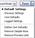 "Define Own Defaults" lets you choose a new preset file that will be used with the Own Defaults function. The "Remove Sample Area" option removes the sample area that was created with the Marquee tool in the preview. Finally, the "Remove Preview Limit" option removes the preview limit frame that was added with the preview limit tool.