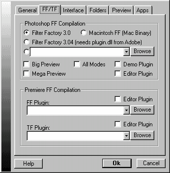 There are four option buttons for selecting the Filter Factory versions you like PiCo to create. The Macintosh Binary files that will be created with the Macintosh FF option (Pro Edition only) have to be transferred to a Macintosh machine and converted to Mac Photoshop plugins by using Stuffit Expander. The fourth option (Pro Edition only) lets you select your own Filter Factory template with the help of the Browse button.