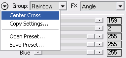 If you click on the arrow-down button at the left of the Group combo box, a menu with various items will appear. The Center Cross option lets you position the preview cross to the center of the preview. The Copy Settings option copies the current filter parameter to the other filters in the same group.