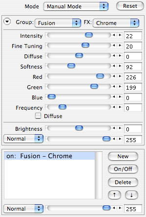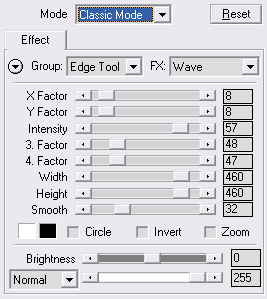 The Blending feature lets you blend the effect with the original image according to 20 different blending modes. The blending mode can be chosen from the combo box and the blending ratio can be adjusted with the slider at the right. A value of 255 will show the effect for some modes or show a blended version of the effect and original at other blending modes. A value of zero will use no blending at all and display the original image. The default values are Normal blend mode and a value of 255 for the slider.