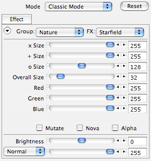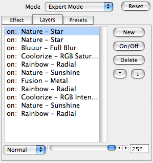 Unlike the other modes Expert Mode offers all available controls. It has three tab sheets at the top. The Effect tab sheet is identical to the Classic Mode (see above), the Layers tab sheet contains the same controls as the middle frame in Manual Mode and the Presets tab sheet is similar to Novice Mode.
