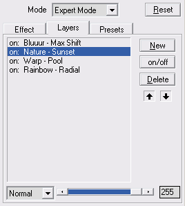 The Layers tab sheet allows you to apply more than one Plugin Galaxy effect to the image without having to run Plugin Galaxy multiple times. The layers features works similar to the Layers palette in Photoshop and other graphics applications. The list box at the left displays the layers. When you run Plugin Galaxy for the first time or after you clicked on the Reset button, you will only see one layer in the list. This means that only one effect is applied to the image, because each layer only contains one effect. An layer item like "on: Nature - Sunset" consists of three parts: "on" or "off" indicates if the layer is active or deactivated, the second part is the name of the effect group and the third part tells you the name of the effect. The effect of the bottom layer in the list will be applied first to the image and the effect of the top layer will be applied last.
