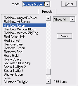 Novice Mode displays a list of presets from the presets sub folder of the Application Data folder (see below under The Presets Tab Sheet for the full path!). The combo box at the right of the presets list lets you choose which presets to display and which to hide. The Show All option presents all presets, the Own options shows presets that were saved by yourself, the Included option displays presets that were delivered with Plugin Galaxy, the Single Layer option shows simple effect preset and the Multi Layer option displays presets with more complex effects. The remaining options lets you display presets that use a certain effect group. The label at the bottom shows you how many presets are displayed in the preset list.