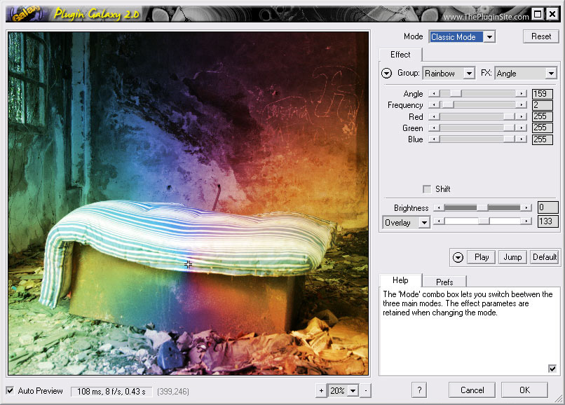 Plugin Galaxy offers four modes: Novice Mode, Classic Mode, Manual Mode and Expert Mode. Expert Mode offers all controls whereas the other three have several controls hidden to make it easier for beginners to start. For more information see the Modes page. Plugin Galaxy features a total of more than 160 effects which are sorted into 17 different filter groups. For more information on the various filter groups, please read the Effects page. Additionally Plugin Galaxy offers preset and layer options, which are described on the Modes page. If you want to batch process images, please read the Cloak Mode page.